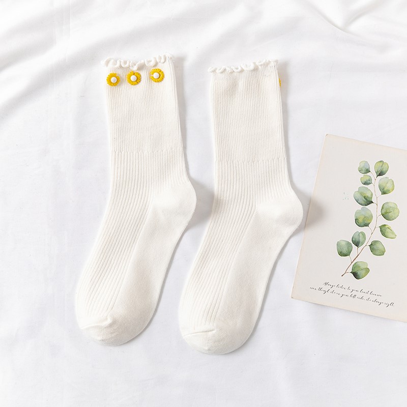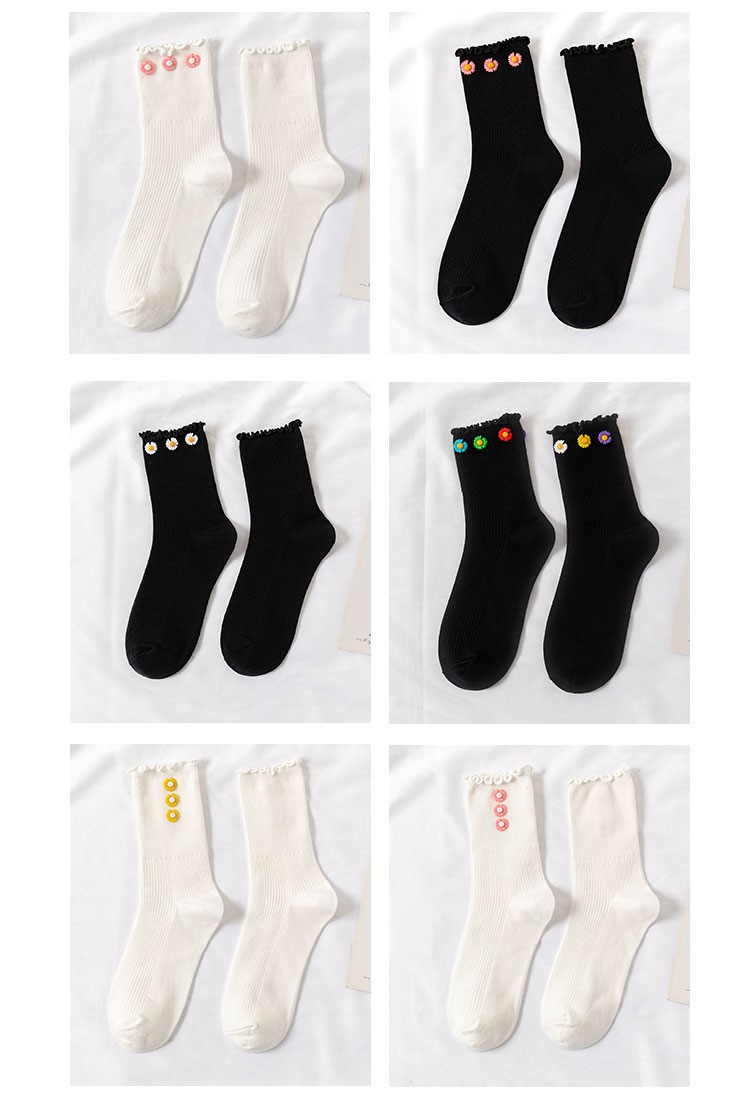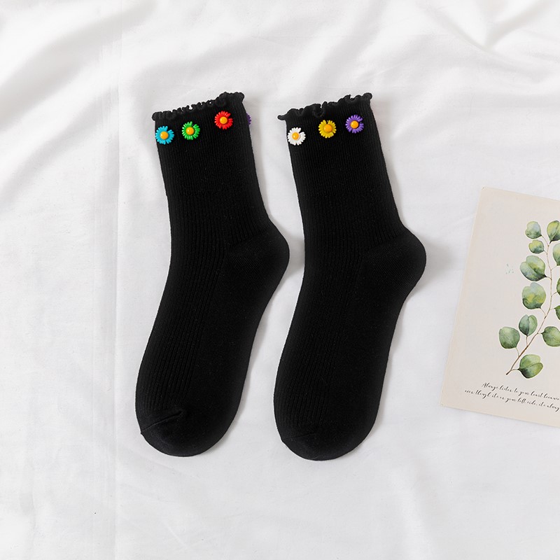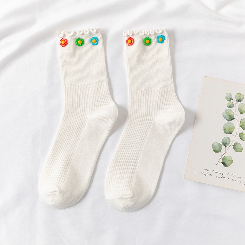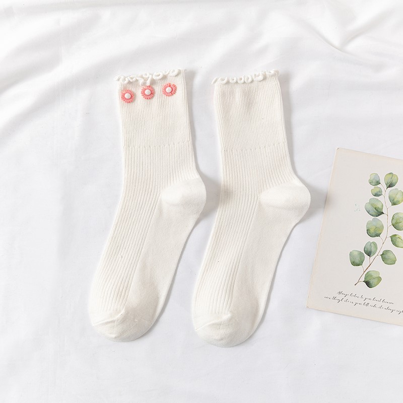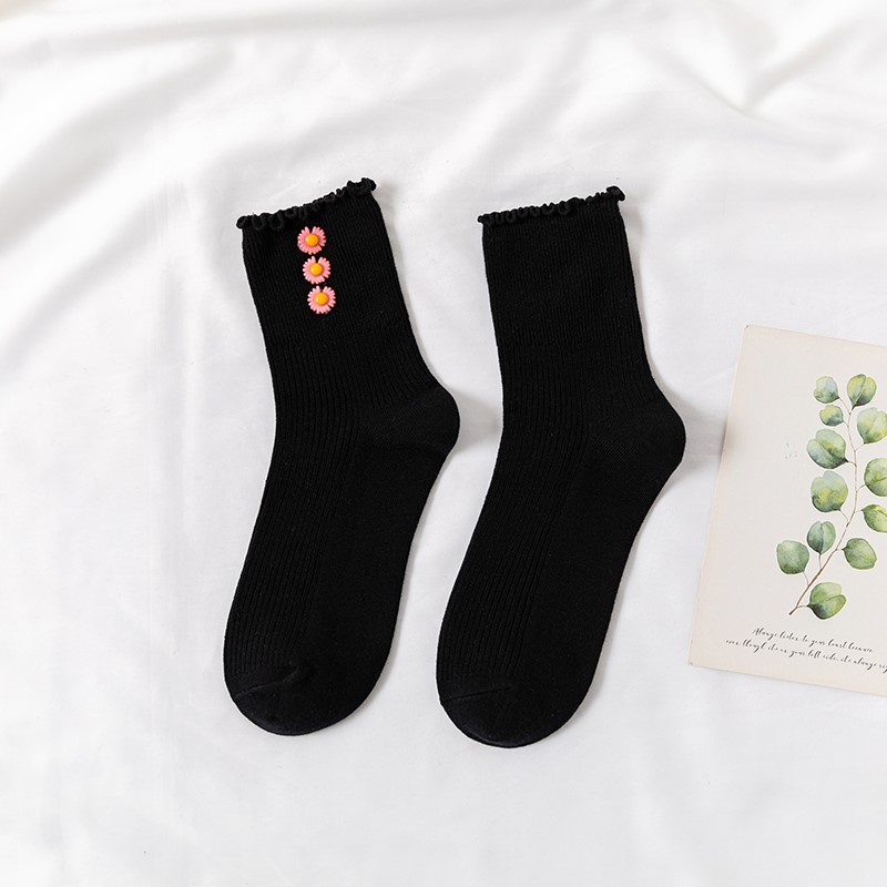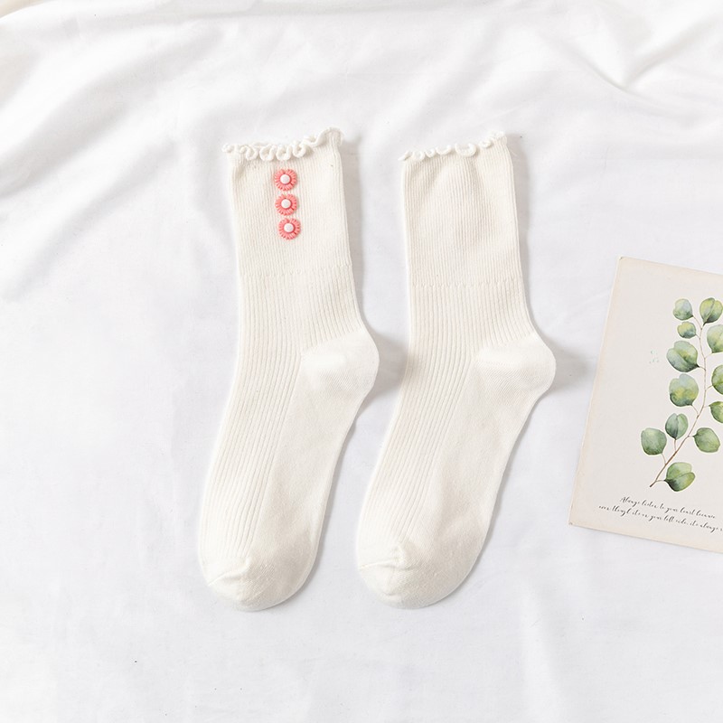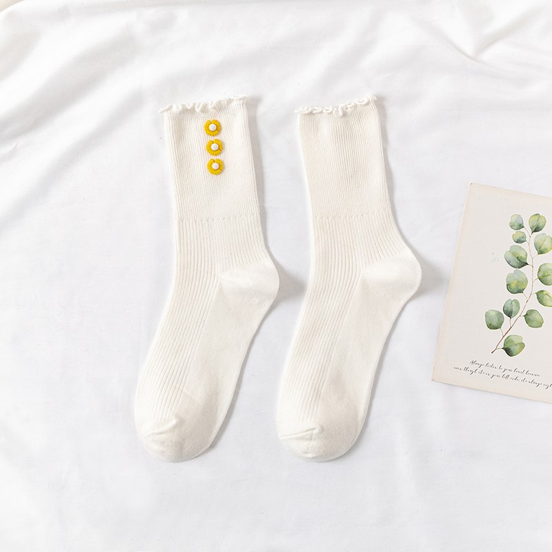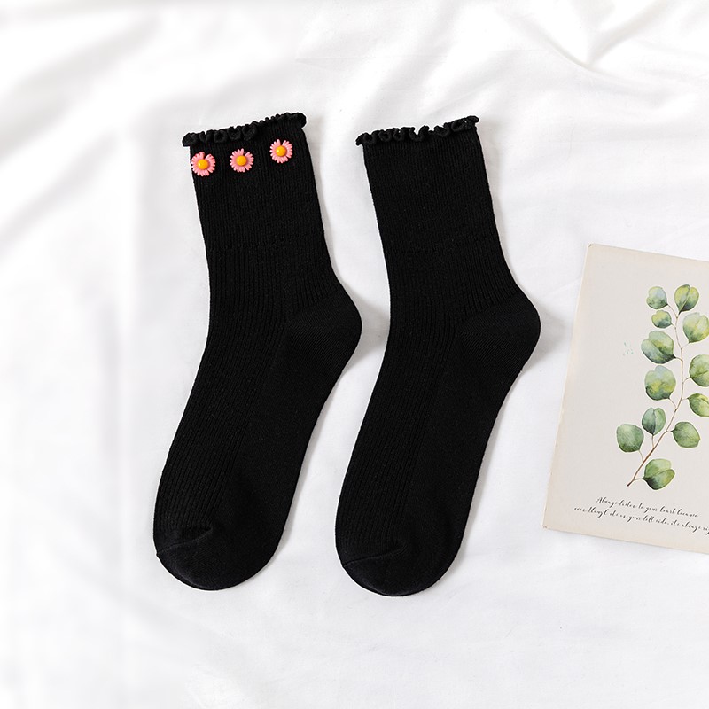Cotton socks with small chrysanthemum buckle and wood ears