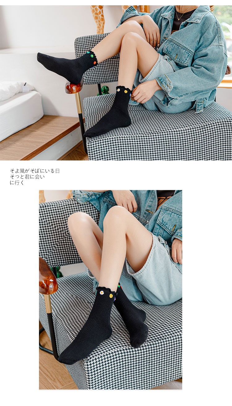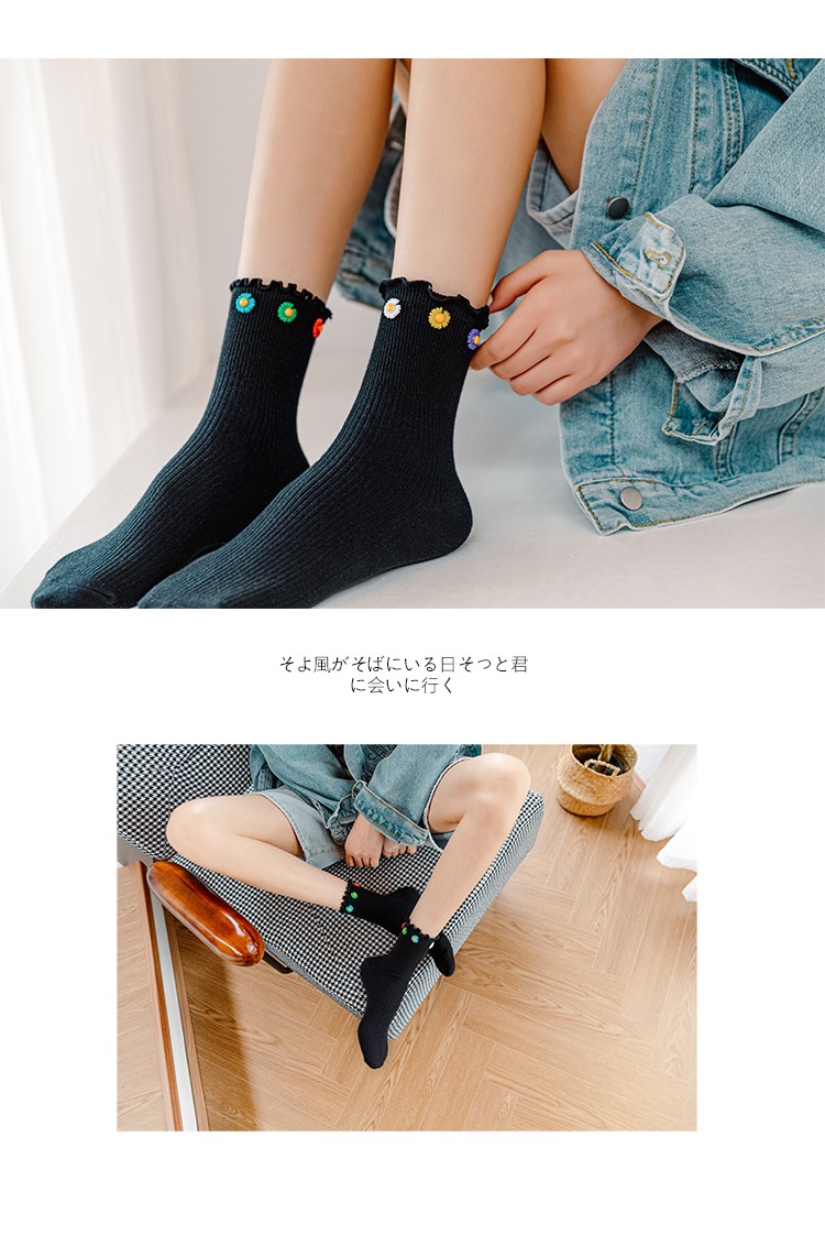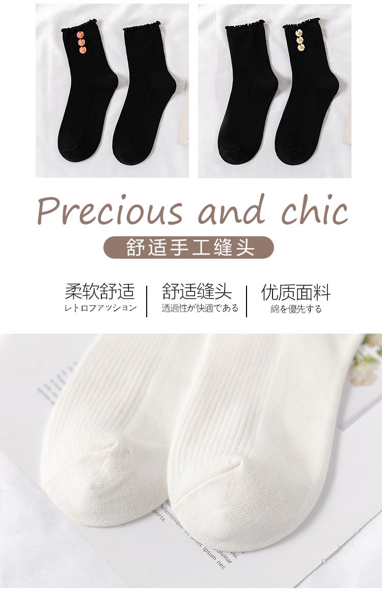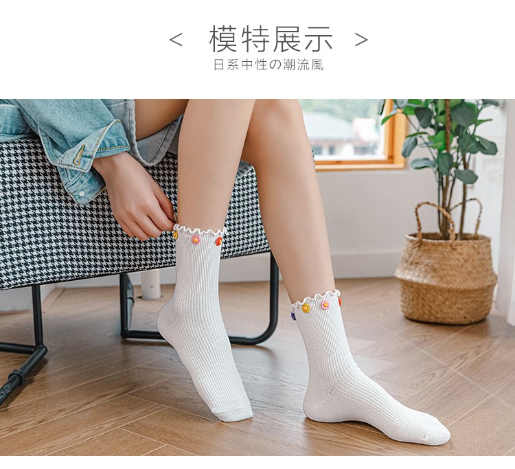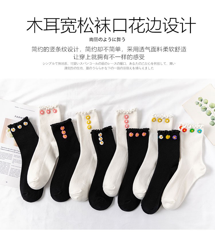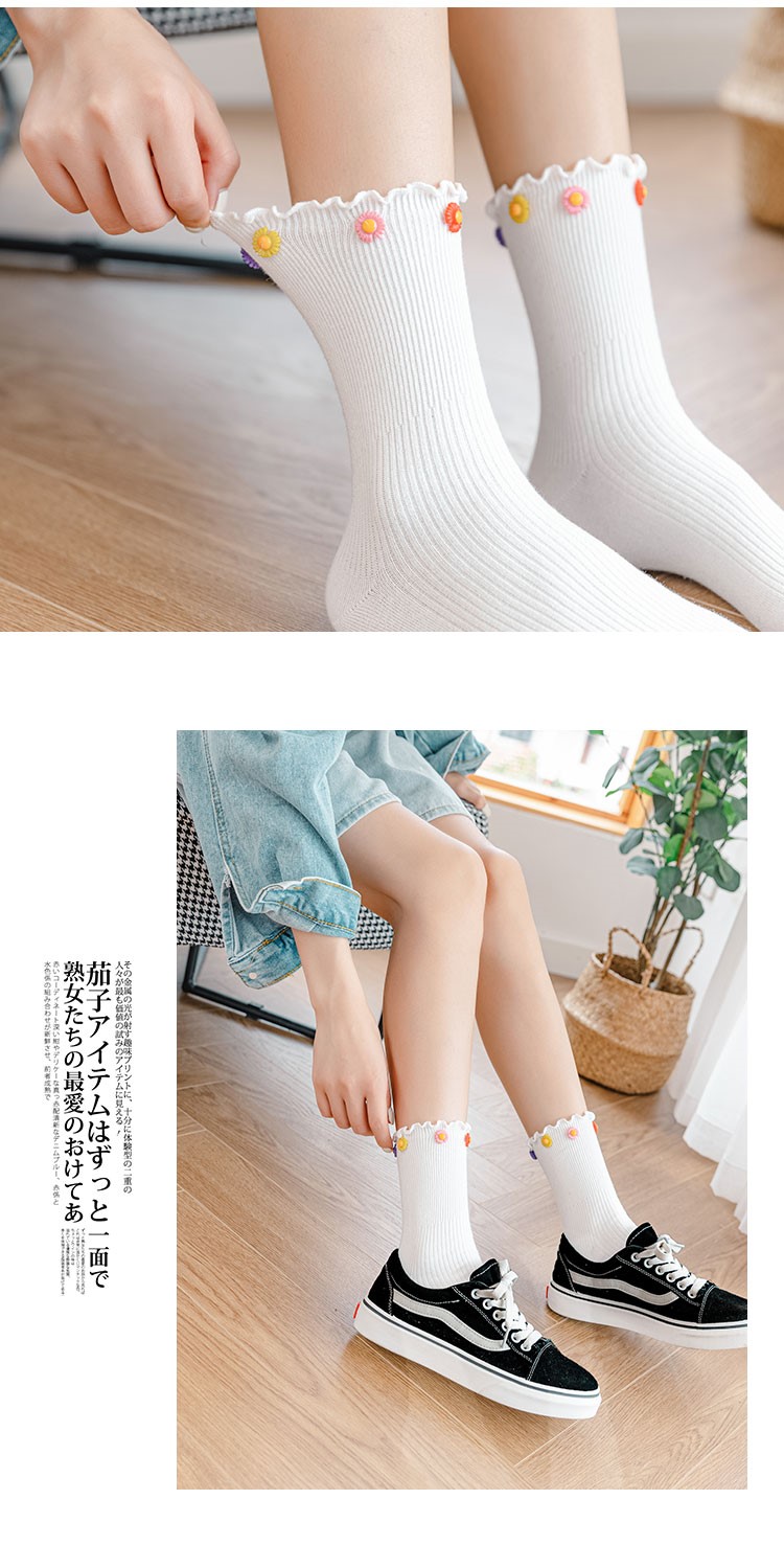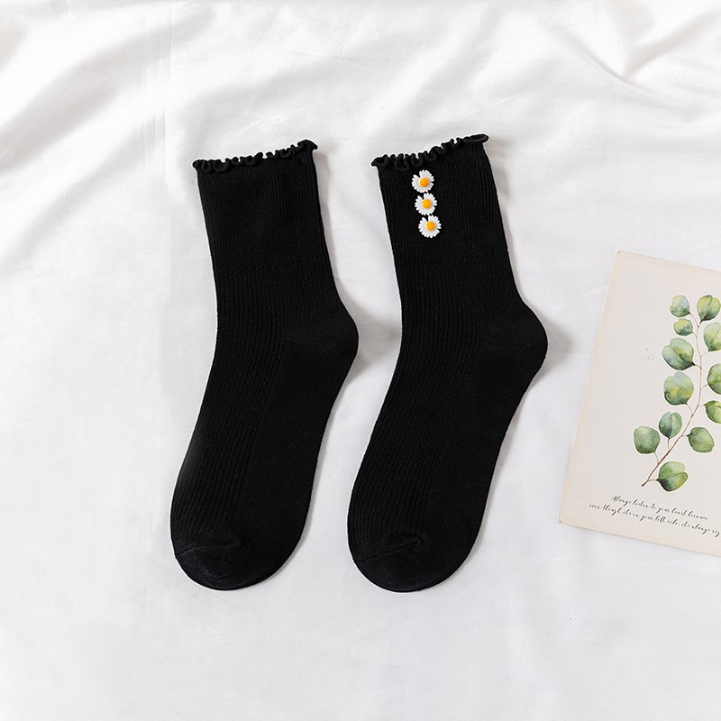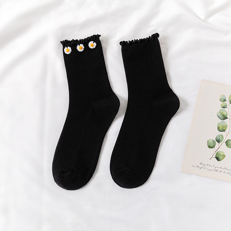Cotton socks with small chrysanthemum buckle and wood ears